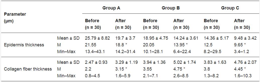 Die Epidermisdicke vor der Behandlungsserie betrug 12,5 µm, während sie nach den Behandlungen auf 9,65 µm abnahm. Die Unterschiede waren in jedem analysierten Fall statistisch signifikant.